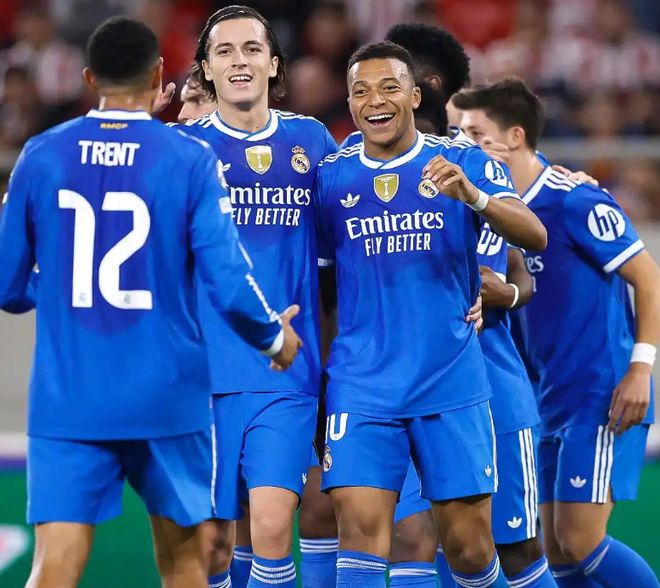 今天欧冠赛场高光的高光,尴尬的尴尬,比如英超领头羊阿森纳,皇马头牌姆巴佩,英超卫冕冠军利物浦。皇马上周末在西甲联赛又一次被弱旅逼平,今天皇马还是有些低迷,又是客场对阵弱旅,开场仅7分钟,皇马后防就再次受到打击,奥林匹亚科斯前场中路打出一连串精妙配合撕破皇马防线,卡比禁区弧顶处策应做球,后排跟进的奇奎尼奥迎球右脚大力兜射,皮球直入球门右下死角,奥林匹亚科斯1:0取得梦幻开局。既然防不住,那就用进攻说话,早早丢球的皇马展开猛烈反扑,第21分钟,皇马左路发起进攻,维尼修斯中线处送出精妙的过顶斜塞,姆巴佩高速插上,禁区弧顶处抢在2名回防球员包夹之前,半单刀大力扫射,皮球从门将佐拉基斯裆下穿过直入网窝,皇马1:1扳平比分。
